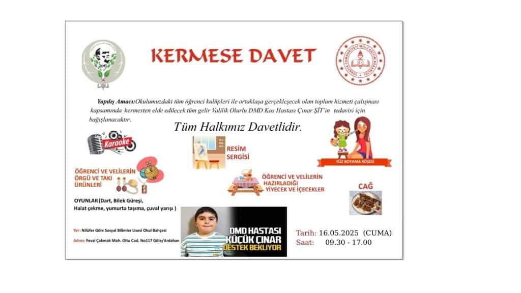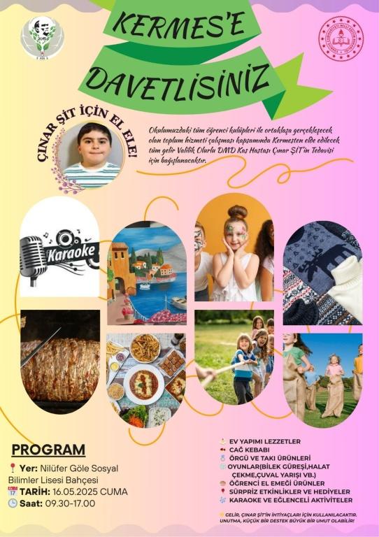 Nilüfer Göle Sosyal Bilimler Lisesi olarak, DMD (Duchenne Musküler Distrofi) kas hastalığı ile mücadele eden Çınar ŞİT için yürekten gelen bir dayanışma kermesi düzenledik. Henüz çok küçük yaşta bu zorlu hastalıkla mücadele eden Çınar için el birliğiyle hazırladığımız etkinlik, büyük bir katılım ve yoğun ilgiyle gerçekleşti.